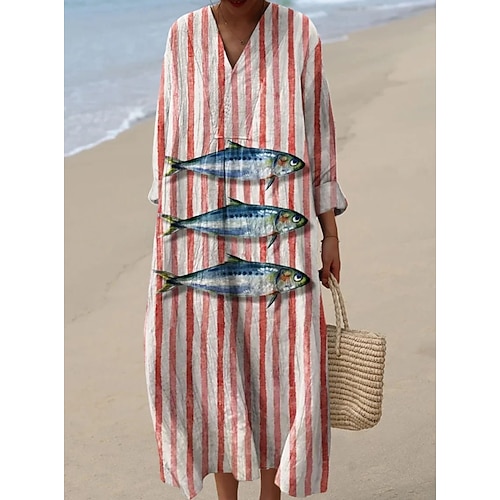 Per donna Abito maxi Vestito Estivo Abito a Tubino Vacanza Casual Spiaggia Uscire Vestibilità comoda Grafico Geometrico Astratto Manica Lunga Scollo a V Bianco Rosso Estate Primavera