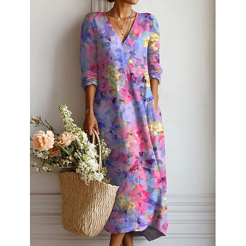 Pasqua Per donna Abito Midi Vestito Estivo Abito a trapezio Vacanza Casual Boho Ferie Vestibilità regolare Floreale Grafico Blocco di colori Manica Lunga Scollo a V blu navy Rosso Viola chiaro Estate
