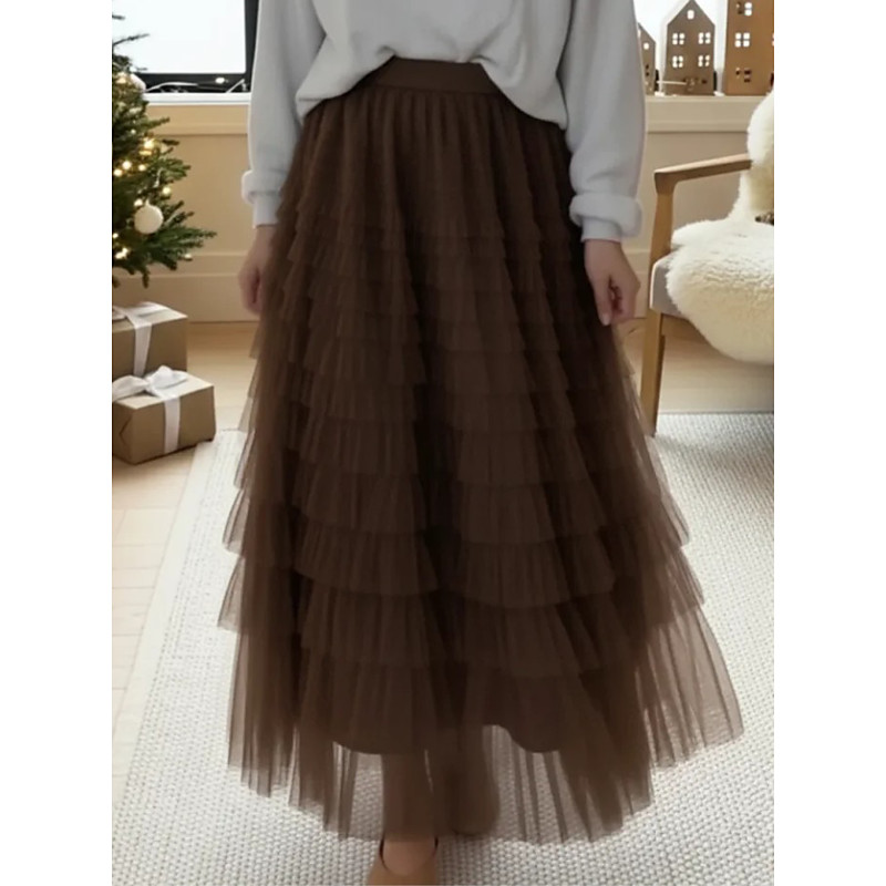 Women's A Line Elegant Maxi Mid Waist Skirts Layered Inelastic Wine Black Pink Brown Spring Tulle