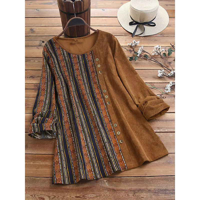 Women's Blouse Floral Vintage Casual Long Sleeve Crew Neck Regular Tops Daily Patchwork Brown Spring Fall Winter