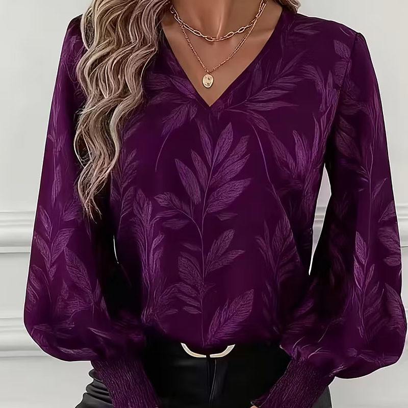 Women's Blouse Dressy Tops Leaf Plain Elegant Vintage Ladies Long Sleeve Puff Sleeve V Neck Regular Tops Daily Work Holiday Ruched Patchwork Print Blue Wine Purple Green Spring Fall