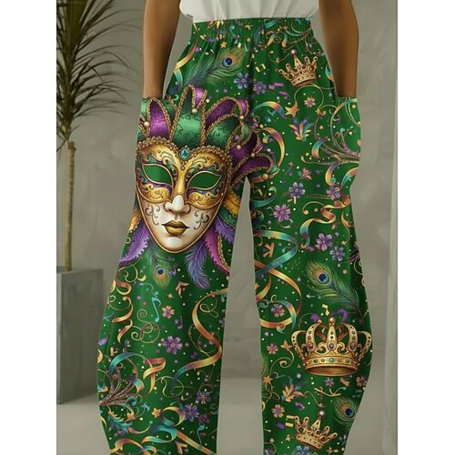 Karnevalshose für Damen, weit geschnitten, Urlaubshose im Vintage- und Ethno-Stil, lange Hose mit hohem Bund, abstraktem Grafikmuster, Kordelzug, Tasche, elastischem Bund, bequem, atmungsaktiv,