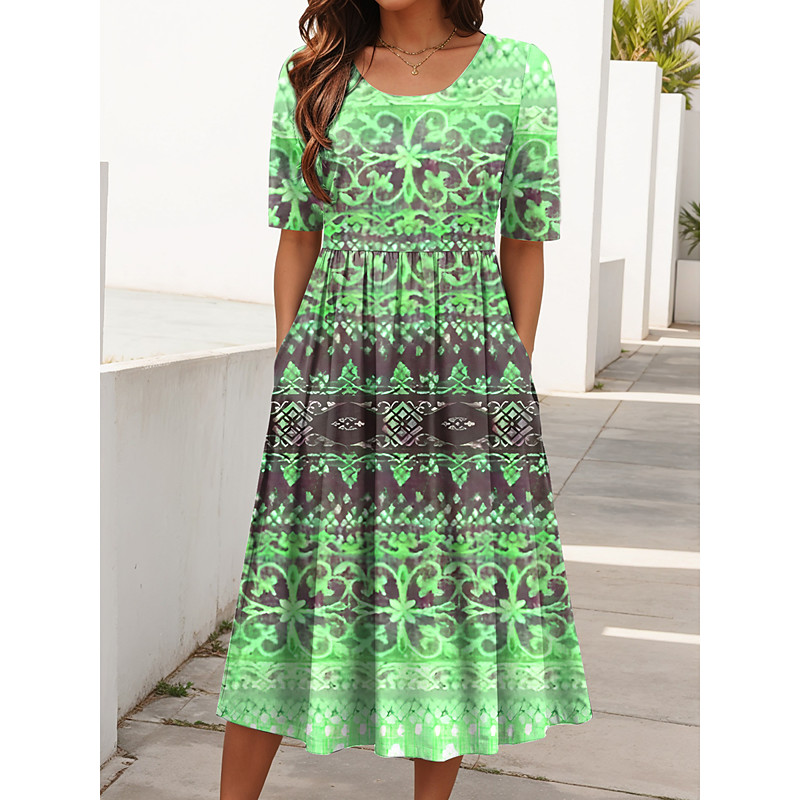 Women's Midi Dress Summer Dress Pleated Dress Vacation Casual Holiday Regular Fit Graphic Geometric Half Sleeve Crew Neck Blue Pink Purple Green Summer Spring Fall