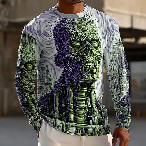 Halloween Herren Optische Täuschung Zombies 3D T Shirt Langarm T-Shirt 3D-Druck Rundhalsausschnitt Hemd Mode Übertrieben Straße Lässig Täglich Blau Grün Grau Sommer Frühling Herbst Bekleidung S M L
