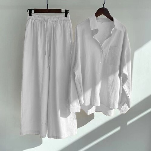 Per donna Camicia Set ispirati al lino Set da due pezzi Pantaloni di Lino Pantaloni Set Manica Lunga Colletto a Camicia Tinta unica Coulisse Moda Streetwear Abbigliamento quotidiano Data Nero Bianco