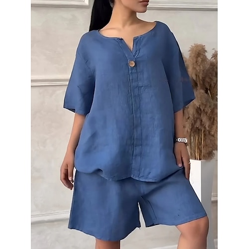 Completo da donna in finto cotone e lino, completo con pantaloncini, maniche a 3/4, scollo a V, tinta unita, moda streetwear, casual, quotidiano, per esterni, blu, bianco, rosa, estivo, vestibilità
