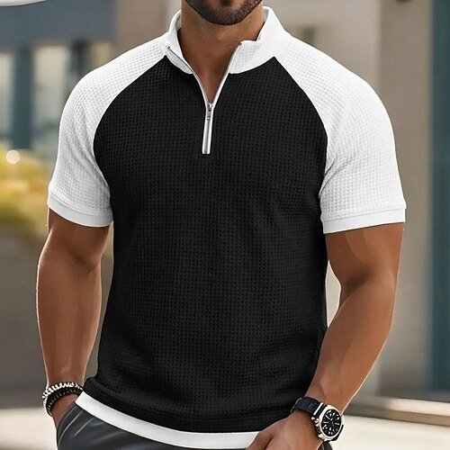 Per uomo Magliette Polo a Nido d'Ape Casuale Ferie Colletto Mao Manica Corta Essenziale Moderno Plaid Blocco di colori Blocco di colore Bottoni Estate Primavera Primavera Estate Oversize Blu Nero