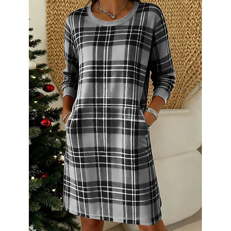 Women's Mini Dress T Shirt Dress Tee Dress Casual Holiday Regular Fit Plaid Long Sleeve Crew Neck Red Dark Grey Fall Winter