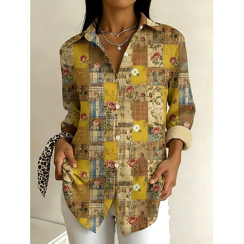 Per donna Camicia Floreale Plaid Elegante Casual Manica Lunga Colletto a Camicia Top Regolari Lavoro Quotidiano Ferie Patchwork Bottoni Stampato Giallo Primavera Autunno