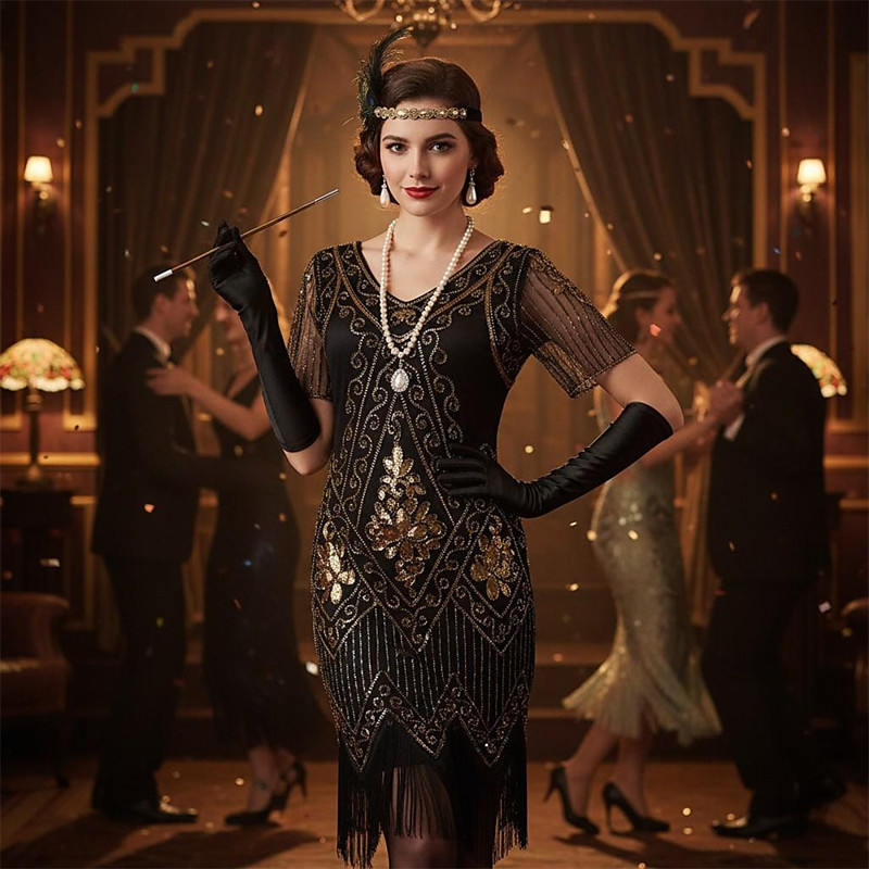 Retro Vintage Roaring 20s 1920s Knee Length Flapper Dress Outfits Accessories Set Short Sleeves The Great Gatsby Wedding Guest Sequins Tassel Fringe Sequin Tassel V Neck Fancy Dress Women's Carnival