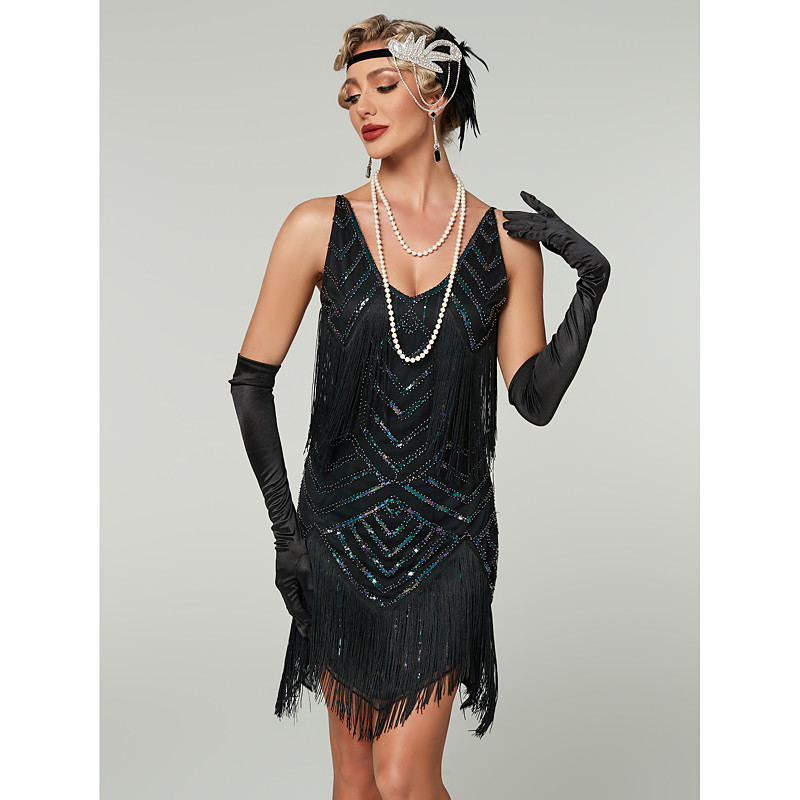 Retro Vintage Roaring 20s 1920s Mini Flapper Dress Dress Sleeveless The Great Gatsby Flapper Girl Sequins Fringe V Neck Fancy Dress Women's Christmas Carnival Wedding Evening Party Masquerade Adults
