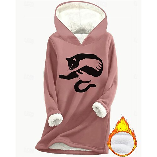 Per donna Felpa con cappuccio Grafico Gatto Caldo Casual Pile Sherpa Manica Lunga Con Cappuccio Top lunghi Streetwear Abbigliamento Quotidiano Casuale Stampato Foderato in pile Rosa scuro Blu Grigio