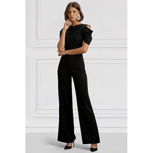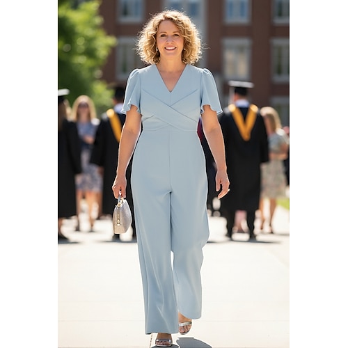 Tute Lunghezza al pavimento Tuta Abito da cerimonia per signora Manica Corta Scollo a V Elegante Semplice Ospite di nozze Riunione di famiglia Tessuto Elasticizzato con Fascia / Nastro Tinta unita