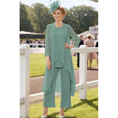 Tuta Completo Pantalone Tre Pezzi Lunghezza al pavimento Abito da cerimonia per signora Senza Maniche Scollo a Barca Elegante Taglie Forti Con Stola Ospite di nozze Chiffon Abiti con Giacca con Tinta