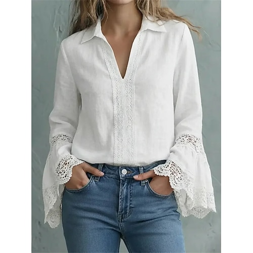 Per donna Blusa Top Eleganti Top in pizzo Bordo in pizzo Drappeggiato Tinta unica Semplice Elegante Vintage Signore Manica Lunga Scollo a V Top Regolari Quotidiano Lavoro Ferie Nero Bianco Vino