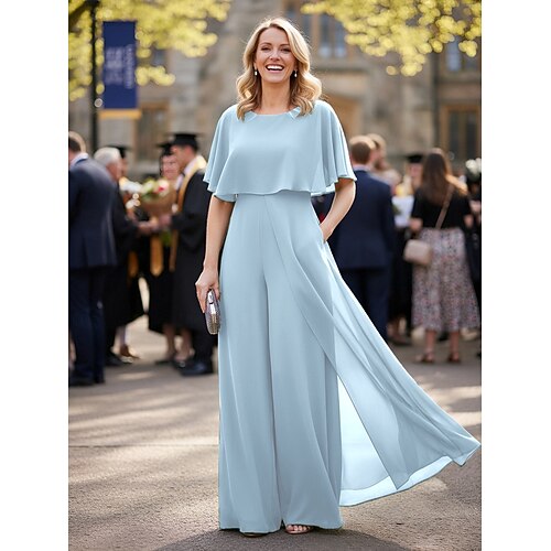 Tute Lunghezza al pavimento Abito da cerimonia per signora Manica Corta Girocollo Elegante Semplice Formale Ospite di nozze Chiffon con Tinta unita