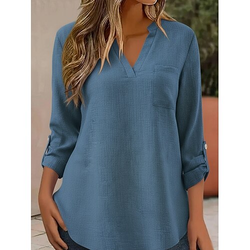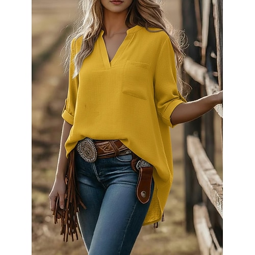 Per donna Top estivi Blusa Top Eleganti Arricciato Patchwork Tasca Tinta unica Semplice Elegante Vintage Signore Manica 3/4 Colletto a Camicia Top Regolari Quotidiano Lavoro Uscire Blu Giallo Viola