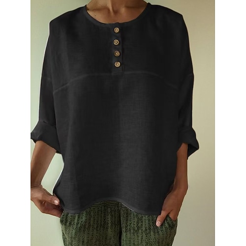 Per donna Camicie di cotone e lino Elegante Bohemien Vintage Manica Lunga Girocollo Top Regolari Quotidiano Ferie Bottoni Rosso-arancio Nero Bianco Rosa Azzurro cielo Estate Primavera Autunno Inverno