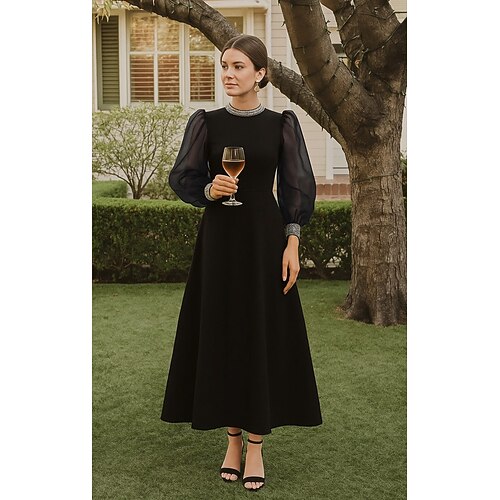 Linea ad A Lunghezza Tè Abiti da Cocktail Abiti da festa Abito svasato Elegante Manica Lunga Girocollo Festa in giardino Matrimonio Crepe Elasticizzato con Cristalli