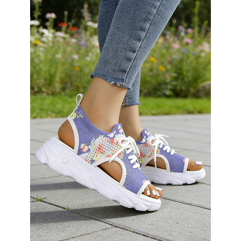 Women's Colorful Floral Print Platform Sandals - Lace-Up Open-Toe Sneaker Sandals for Summer Outings, Walking and Casual Vacation