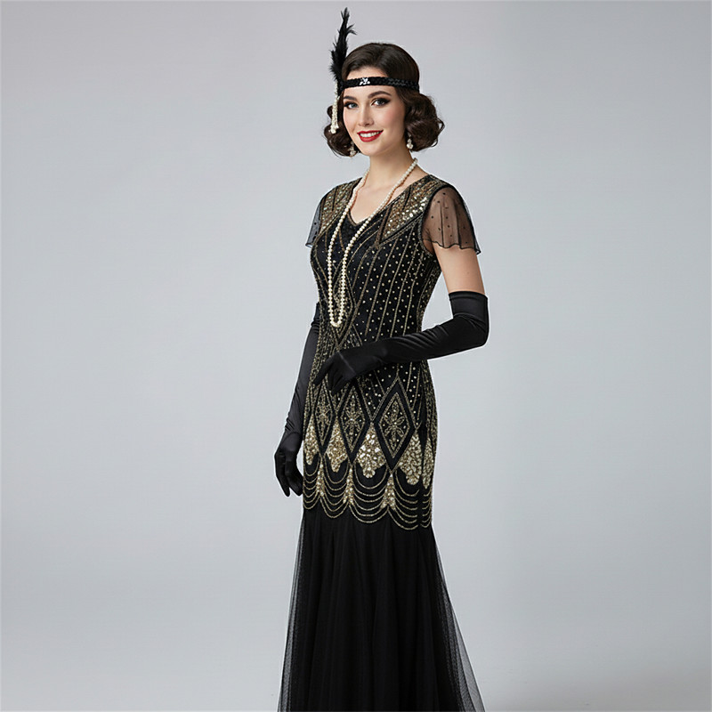 Retro Vintage Roaring 20s 1920s Floor Length Dress Christmas Party Dress Evening Dress Short Sleeves The Great Gatsby Wedding Guest Sequins V Neck Fancy Dress Women's Carnival Masquerade Wedding