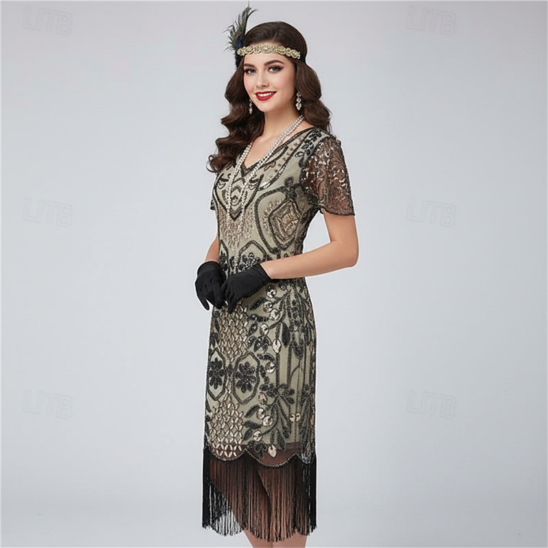 Roaring 20s 1920s Cocktail Dress Knee Length Flapper Dress Dress Prom Dress Short Sleeves The Great Gatsby Charleston Sequins Tassel Fringe V Neck Fancy Dress Women's Carnival Masquerade Carnival