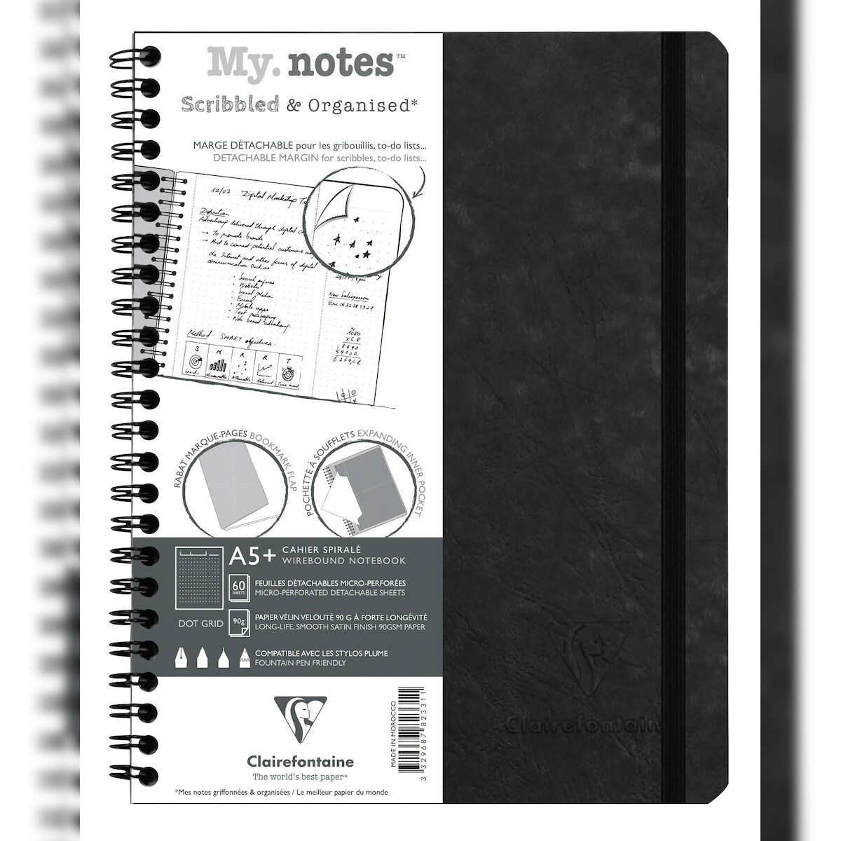 Clairefontaine 5x My.Notes Age Bag, Spiralheft A5+, 60 Blatt 90g, DOT mit Kopfleiste, abtrennbar, mikroperforiert - Schwarz 782331C