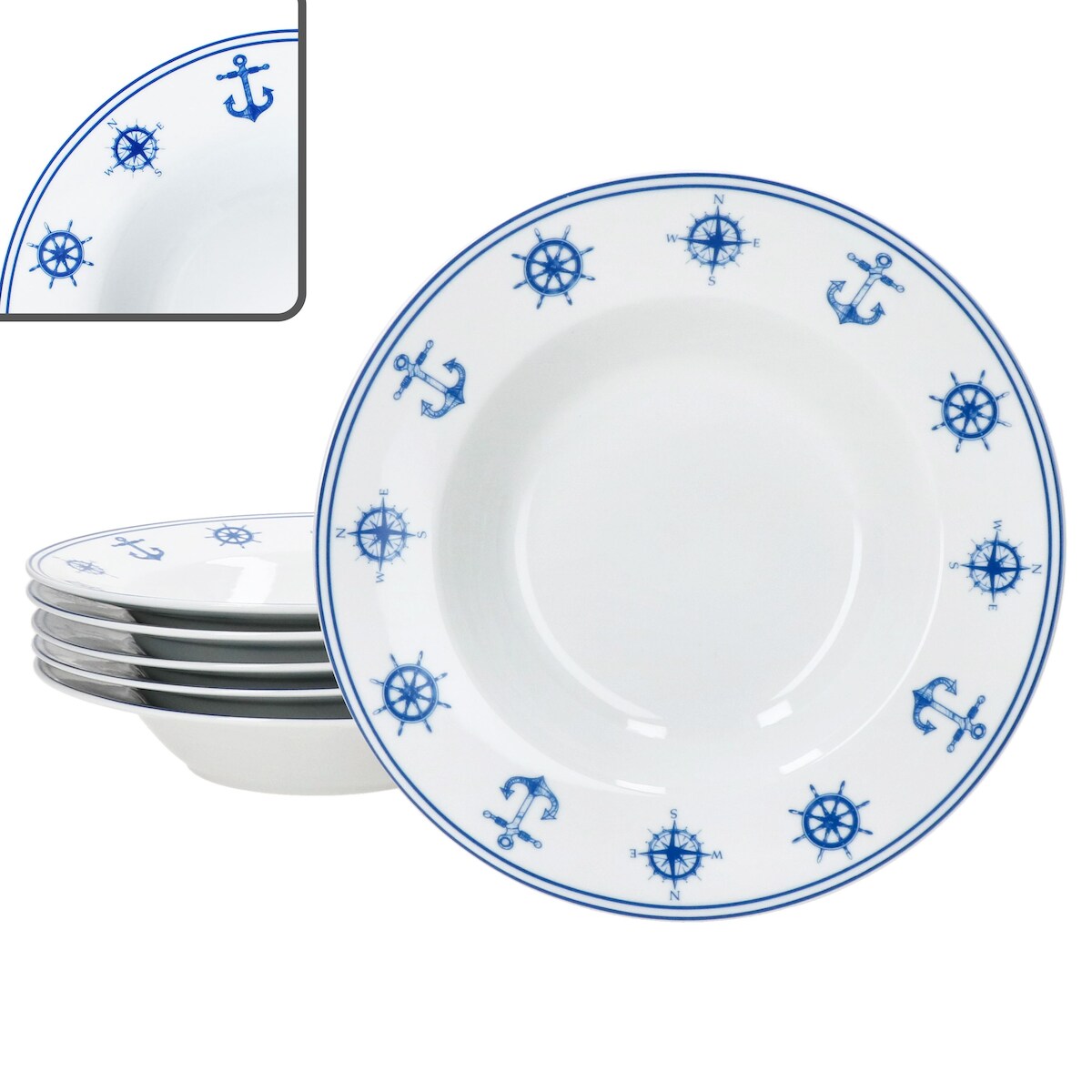 Ahoi 6x Suppenteller 180ml Porzellan 6 Pers. tiefe Teller Pasta nautisch Anker