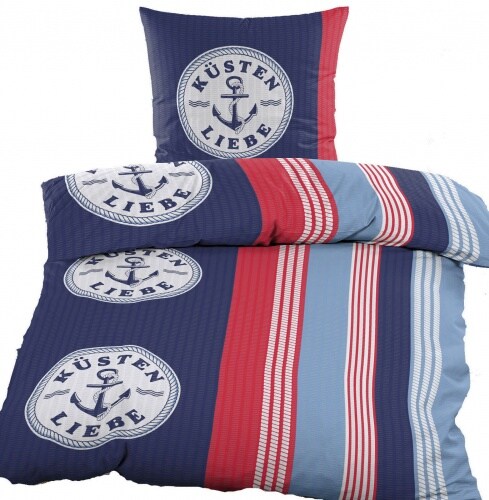 2-tlg. Seersucker Bettwäsche 135x200 +80x80cm, rot blau weiß, Anker/Küstenliebe, bügelfrei