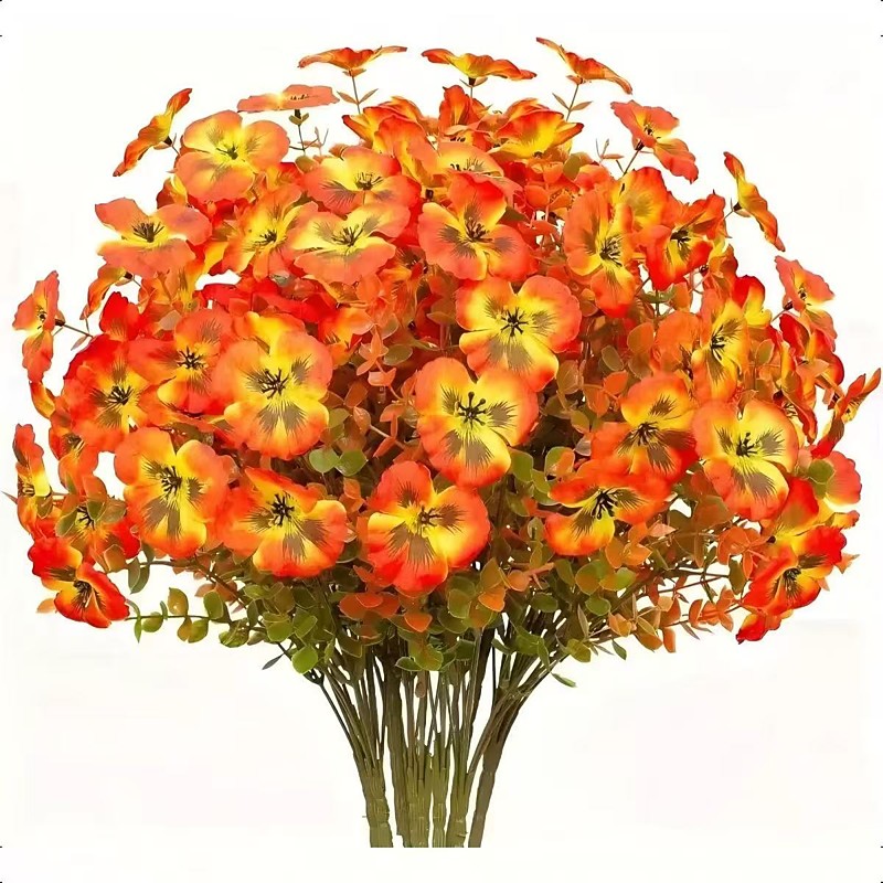 8 Bundles Artificial Fall Flowers, Faux Eucalyptus, Pansies and Butterfly Orchids, UV Resistant Outdoor Fake Plants for Garden, Porch, Patio, Front Door, Window Box Yard Decorations