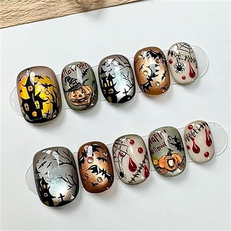 30Pcs Cat Nails Halloween Press on Nails Short Fake Nails with Goth Bat Pumpkin Spider Web Designs Silver Orange False Nails Full Cover Artificial Glue on Nails Cute Stick on Nails for Women DIY
