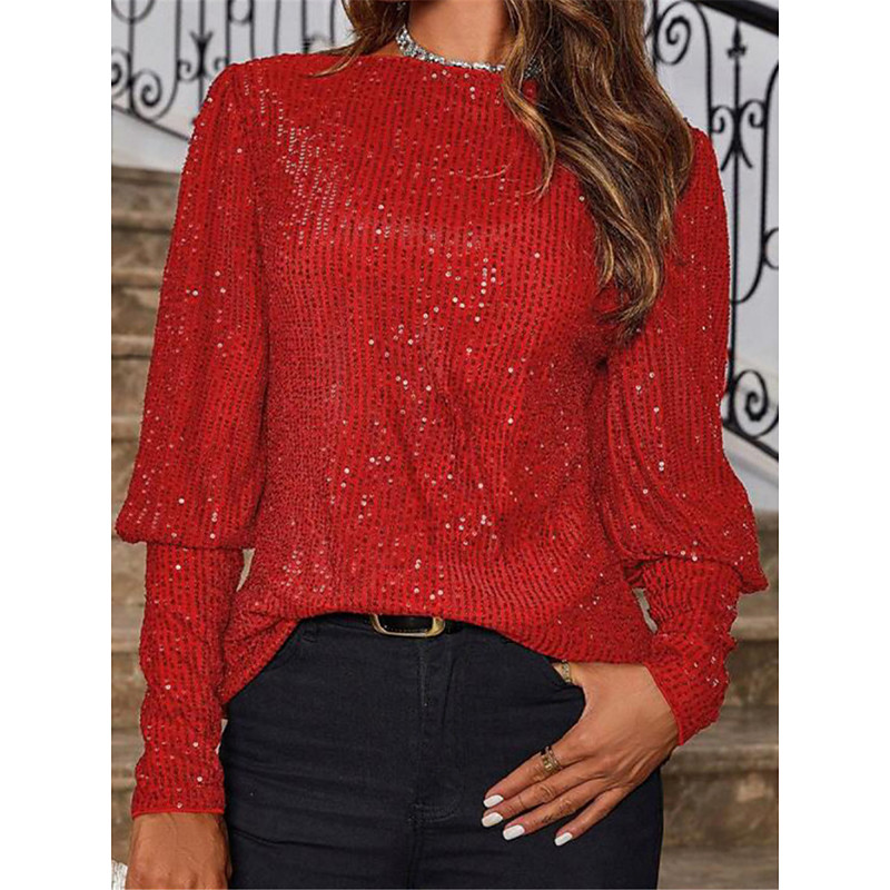 Women's Shirt Blouse Basic Casual Sequins Long Sleeve Regular Tops Crew Neck Daily Red Fuchsia Fall Winter