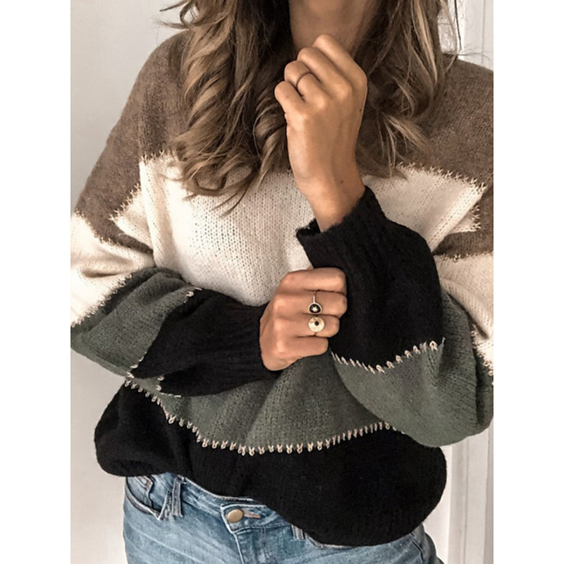 Women's Sweater Pullover Fashion Striped Ribbed Crew Neck Knitted Long Sleeve Regular Tops Knit Outdoor Going out Weekend Black White Fall