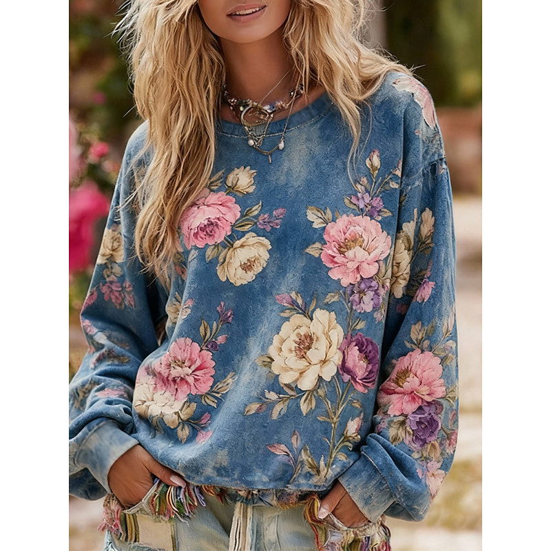 Women's Pullover Sweatshirt Floral Vintage Casual Boho Long Sleeve Crew Neck Regular Tops Street Dailywear Casual Print Blue Spring Fall Winter