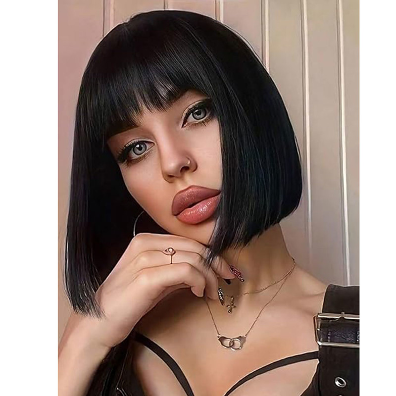 Blue Bob Wigs for Women Short Hair Wig with Bangs Straight Bob Wigs with Middle Part Soft Synthetic Full Wigs for Daily Party Use 14 Inches Halloween Wigs