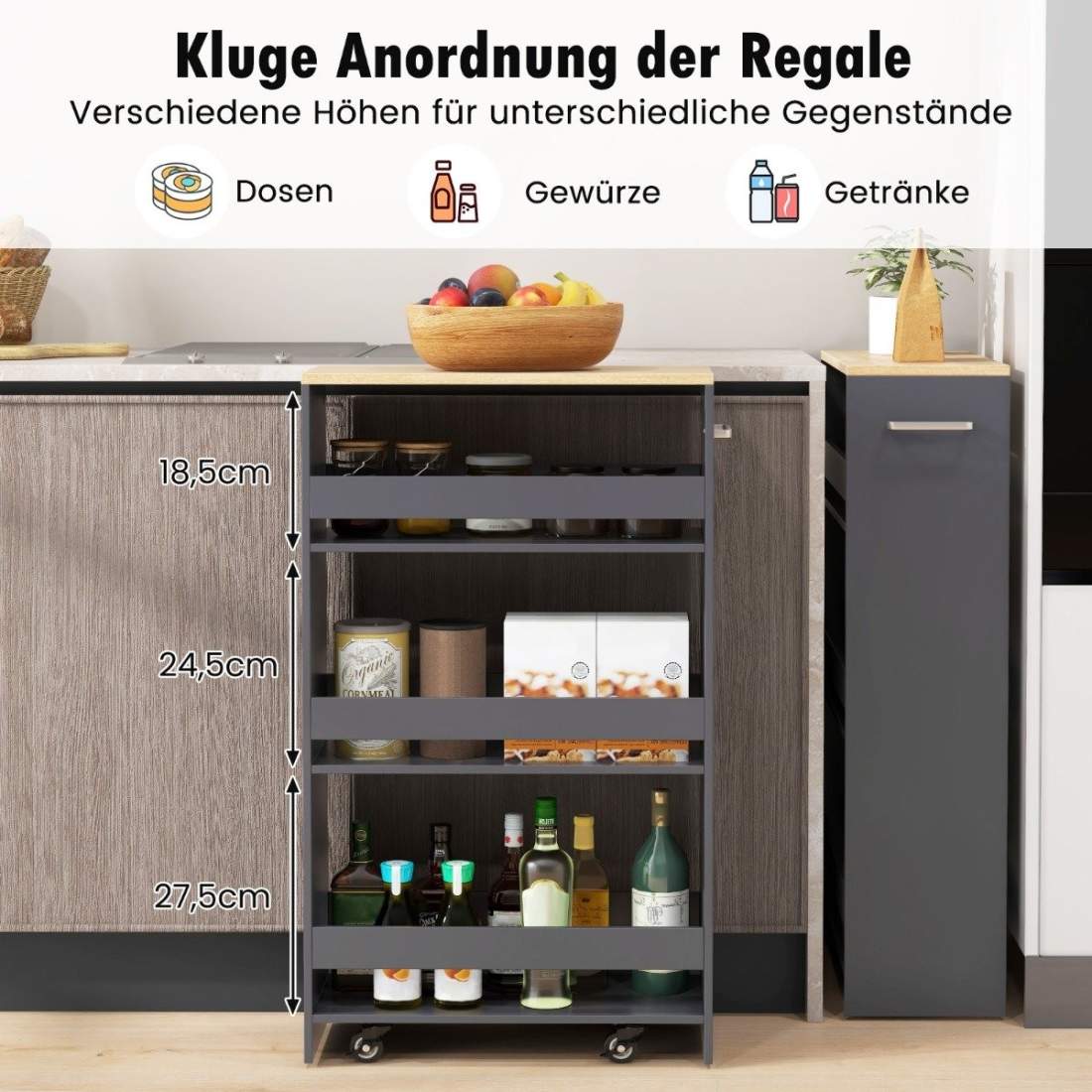 Slank 4-lags rullende kjøkkenvogn – 20 cm bred, grå