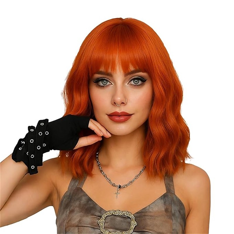 Long Orange Wig with Bangs Wavy Curly Ginger Bangs Wig Synthetic Women Orange Long Wig Natural Looking for Daily and Halloween Party