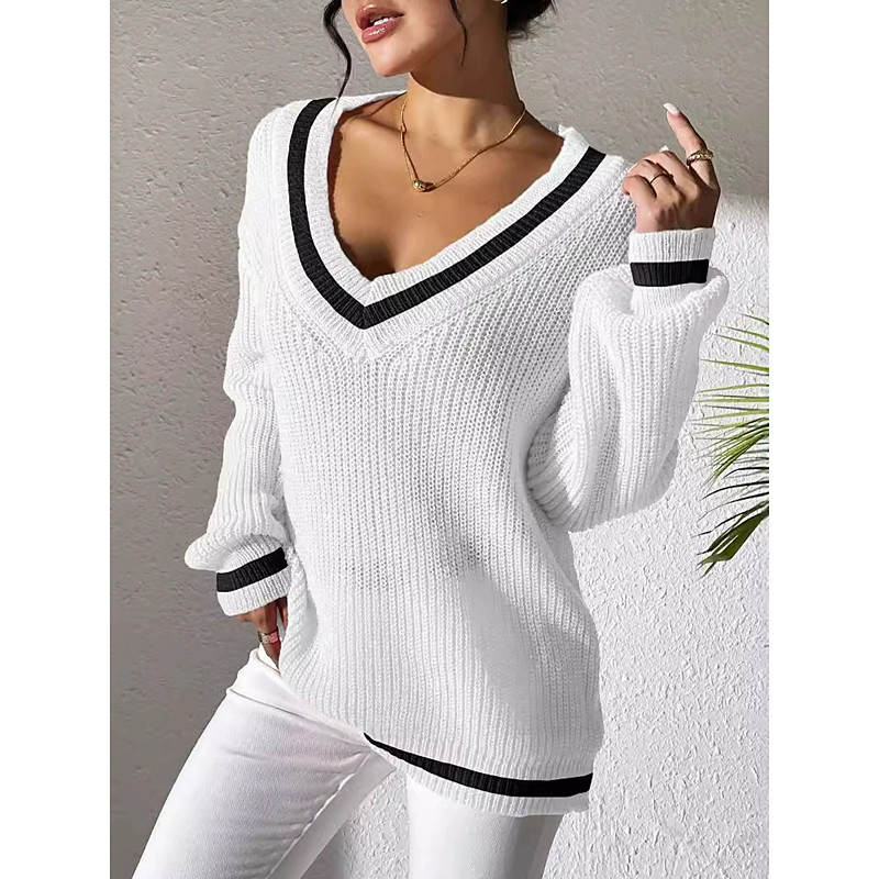 Women's Sweater Pullover Elegant Cute Casual V Neck Patchwork Long Sleeve Regular Tops Knit Daily Date Weekend Black White Fall Winter