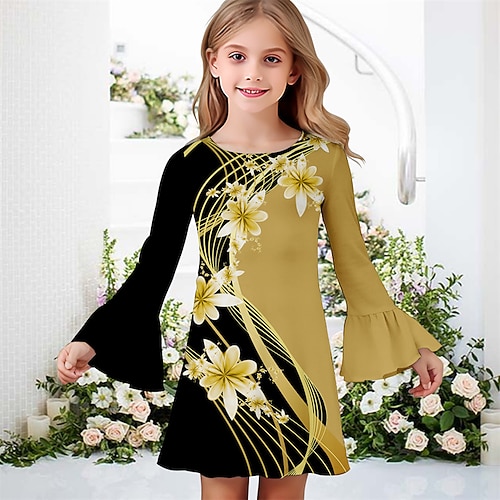 ragazze' 3D Fiore Abito Vestito con Volant Manica Lunga Estate Primavera Vacanza Quotidiano Ferie Bello Dolce Bambini 4-12 Anni Vestito Casual Lunghezza al ginocchio Vestibilità regolare