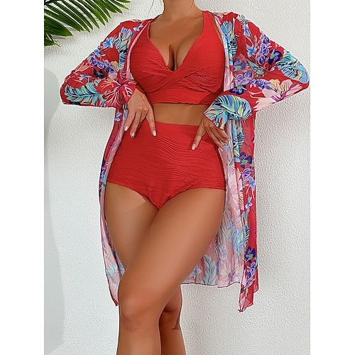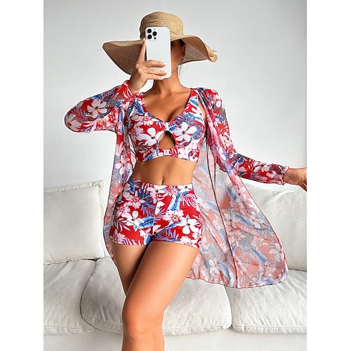 Costume da bagno bikini da donna in 3 pezzi schiena scoperta estate in spiaggia foglie floreali scollo a V senza maniche