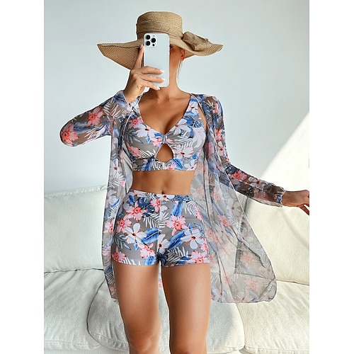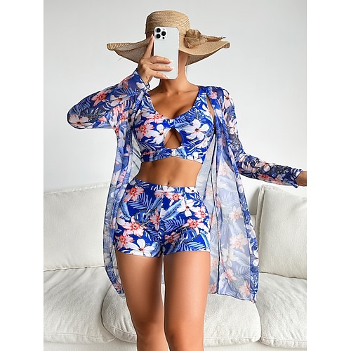 Costume da bagno da donna bikini a 3 pezzi con pantaloni corti schiena scoperta abbigliamento da spiaggia per le vacanze costumi da bagno senza maniche a collo V con foglie floreali