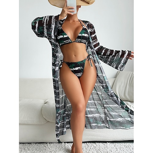 Costume da bagno bikini da donna 3 pezzi palma a taglio vivace snellente senza schienale vacanza spiaggia abbigliamento grafico foglie scollo a halter senza maniche