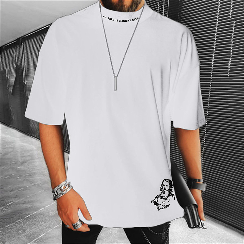 Men's Oversized Graphic T-Shirt, Grey Short Sleeve Mock Neck with 'DA VRKD' S MAGIUNT CNUL' Collar Print for Casual Lifestyle