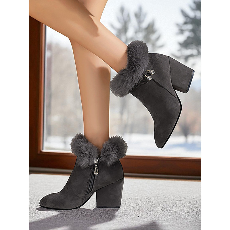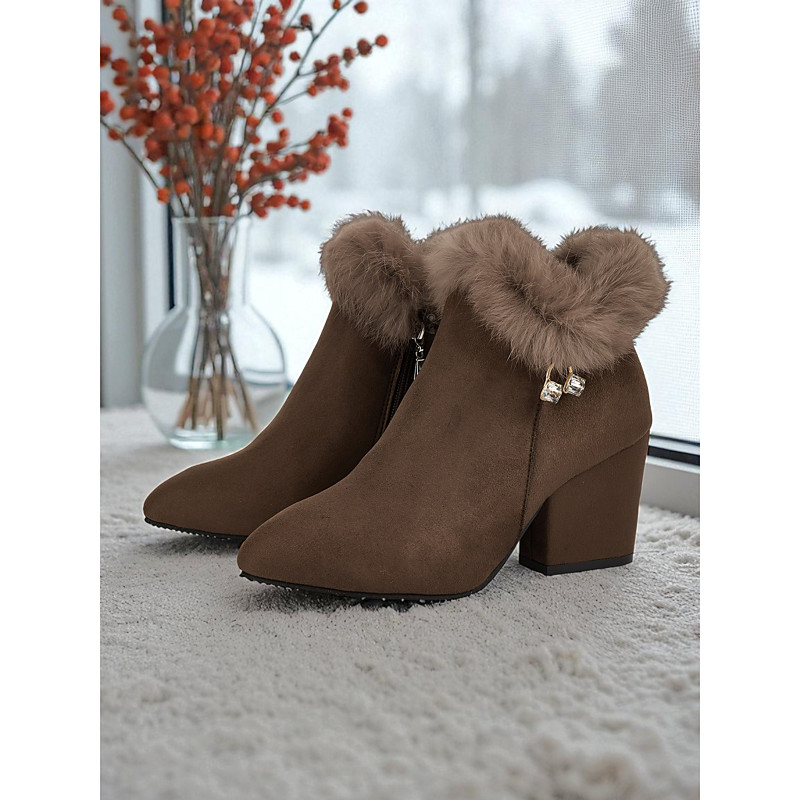 Women's Brown Faux Suede Block Heel Ankle Boots with Plush Fur Collar and Rhinestone Charm - Warm Winter Dress Boots for Work and Holiday