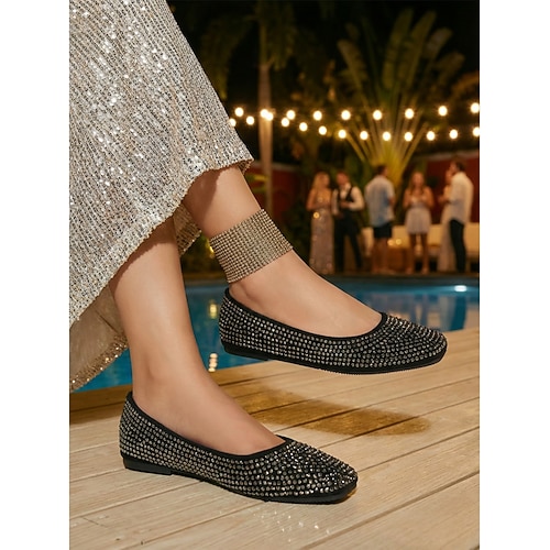 Goldene Damen-Ballerinas mit Strasssteinen und funkelndem Knöchelriemen – elegante, kristallverzierte Schuhe für luxuriöse Resortabende und Galas