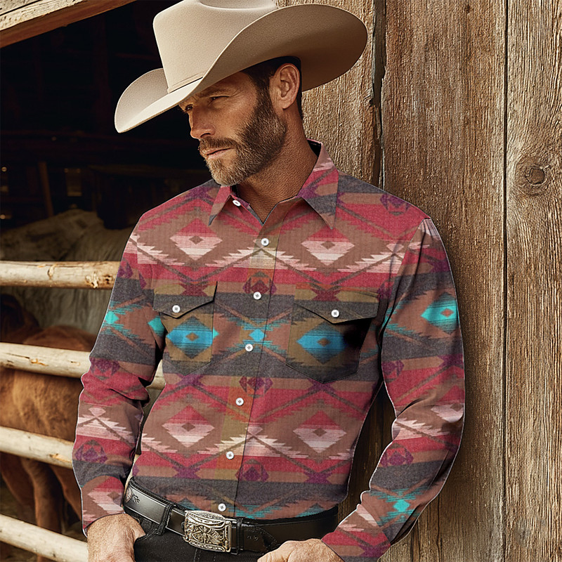 Men's Aztec Ethnic Indian Culture Shirt Western Shirt Cowboy Shirt Long Sleeve Vintage Retro Outdoor Casual WorkWear Spring Fall Turndown Front Two Pockets Linen Like Shirt Button Up Shirts Pink