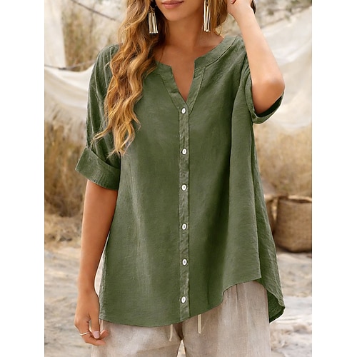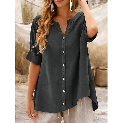 Blusa in cotone e lino da donna Colore solido Elegante Stiloso Base Maniche corte V collo Top regolari Quotidiano Blu Nero Viola Verde Beige Estate Primavera Autunno
