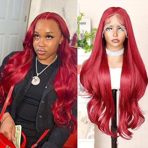 Synthetische Spitzenperücke Bodywave Stil 30 Zoll Rot Mittelscheitel 13x6 Spitzenfront Perücke Damen Perücke Rot / Weiß