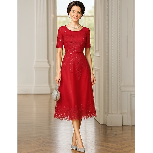 A-Line Abito da Festa Lunghezza Tè Abito Cocktail Abito da Sposa per Invitate Abito Madre della Sposa Manica Corta Girocollo Elegante Lussuoso Formale Cotone Mist con Ricamo