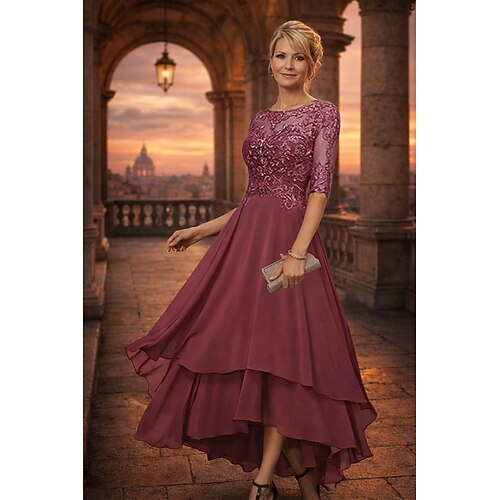 Abito da Festa A-Line Asimmetrico Abito da Cocktail Abito per Ospiti di Nozze Abito per Madre della Sposa Mezza Manica Collo Barchetta Elegante Semplice Formale Ospite di Nozze con Colore Solido